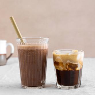- Βάζουμε σε 2 ποτήρια από 4-5 παγάκια και προσθέτουμε από 1 διπλό espresso στο καθένα.