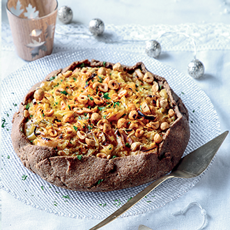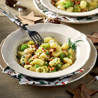 Σε φαρδιά κατσαρόλα λιώνουμε το βούτυρο και σοτάρουμε τα κουκουνάρια, το κρεμμύδι και τα κάστανα για 7-8‘.