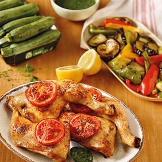 Μπουτάκια κοτόπουλου με σαλάτα ψητών λαχανικών και γκρεμολάτα