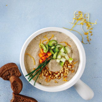 Στο τέλος προσθέτουμε 3 κ.σ. σχοινόπρασο και 1/2 κ.γ. ξύσμα λεμονιού ή πορτοκαλιού, ανακατεύουμε και γαρνίρουμε με 3 κ.σ. κουκουνάρι καβουρντισμένο, κυβάκια από καρότο, ξινόμηλο και σέλερι και λίγο σχοινόπρασο.