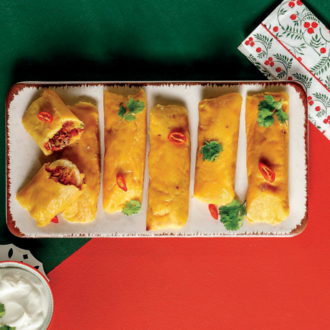 - Για κάθε tamale βάζουμε 1 τετράγωνο φύλλο αλουμινόχαρτου επενδεδυμένο με αντικολλητικό χαρτί σε μια επιφάνεια εργασίας και τοποθετούμε 1 μπάλα ζύμης στο κέντρο. Με υγρά δάχτυλα πιέζουμε τη ζύμη ώστε να γίνει ένα κυκλικό φύλλο 15 εκ. και προσθέτουμε 1/3 φλ. γέμισης στο κέντρο, αφήνοντας 1,5 εκ. περιθώριο στις άκρες. Τοποθετούμε από πάνω από μία φέτα αβγού. Χρησιμοποιούμε το αλουμινόχαρτο για να αναδιπλώσουμε τη ζύμη πάνω από τη γέμιση, από πάνω προς τα κάτω, και μετά από πλευρά σε πλευρά, χρησιμοποιώντας πάντα υγρά δάχτυλα για να σφραγίσουμε τις άκρες. Τυλίγουμε το αλουμινόχαρτο γύρω από τα tamales δημιουργώντας μικρά φακελάκια. Μαγειρεύουμε τα φακελάκια, καλυμμένα, στον ατμό για 1-1½ ώρα ή έως ότου η ζύμη να είναι σταθερή. Ξετυλίγουμε, σερβίρουμε και γαρνίρουμε με την ξινόκρεμα, και, αν θέλουμε, με κόλιανδρο ή τσίλι.