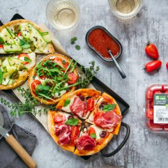 Πίτσα με τοματίνια, ελιές, μανιτάρια και προσούτο