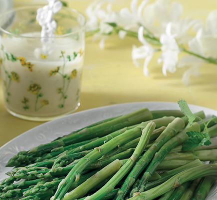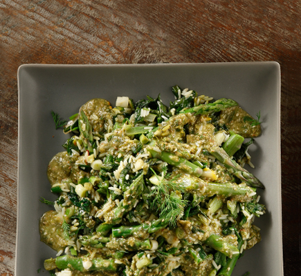 “ Σε μια κατσαρόλα σοτάρουμε στο ελαιόλαδο, σε μέτρια φωτιά, το φρέσκο κρεμμυδάκι με το σαφράν για 6-8 λεπτά. Προσθέτουμε τα μαρούλια, αλατοπίπερο και ανακατεύουμε για 2-3 λεπτά, μέχρι να μαραθούν. Ρίχνουμε το ούζο, αφήνουμε 2 λεπτά να εξατμιστεί το αλκοόλ. Προσθέτουμε το ζωμό, και μαγειρεύουμε για 15 λεπτά. Ρίχνουμε τα σπαράγγια, το μάραθο, το δυόσμο, το ρύζι και το ξύσμα λεμονιού και συνεχίζουμε το μαγείρεμα για άλλα 15 λεπτά, μέχρι να μαλακώσουν όλα τα υλικά. Σε ένα τηγάνι καβουρδίζουμε το σουσάμι σε δυνατή φωτιά για 2-3 λεπτά. Οπως είναι ζεστό, το ρίχνουμε στον πολυκόφτη μαζί με το χυμό λεμονιού