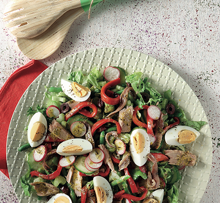 • Σε μια μεγάλη κατσαρόλα ζεσταίνουμε άφθονο αλατισμένο νερό και όταν κοχλάσει ρίχνουμε τα φασολάκια. Τα βράζουμε για 3 – 4’, μέχρι να μαλακώσουν μεν αλλά να παραμείνουν τραγανά. Τα μεταφέρουμε με τρυπητή κουτάλα σε ένα μπολ με παγωμένο νερό για να διατηρήσουν το χρώμα τους και τα στραγγίζουμε καλά. • Σε μια μεγάλη σαλατιέρα ρίχνουμε τα φασολάκια, το μαρούλι, το σέλερι, το αγγούρι, τις πιπεριές Φλωρίνης, τις ελιές, τις αντσούγιες, τα ραπανάκια και τον τόνο και ανακατεύουμε καλά. • Σε ένα μπολάκι χτυπάμε όλα τα υλικά της σάλτσας, με ένα πιρούνι και περιχύνουμε τη σαλάτα. Προσθέτουμε τα αβγά, ανακατεύουμε απαλά και σερβίρουμε.
