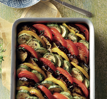 • Ζεσταίνουμε το γκριλ του φούρνου στη μέγιστη θερμοκρασία. • Καλύπτουμε μια λαμαρίνα φούρνου με αντικολλητικό χαρτί, απλώνουμε τις μελιτζάνες σε μονή στρώση και τις περιχύνουμε με το μισό ελαιόλαδο. • Ψήνουμε στο γκριλ μέχρι να ροδίσουν ελαφρώς. Βγάζουμε τη λαμαρίνα και προθερμαίνουμε το φούρνο στους 180° C. • Σε ένα τηγάνι σοτάρουμε το κρεμμύδι με 3 κ. σ. από το υπόλοιπο ελαιλάδο, σε μέτρια φωτιά, μέχρι να μαλακώσει, για περίπου 10’. Προσθέτουμε το σκόρδο και αφήνουμε μέχρι να αφήσει τα αρώματά του. • Παράλληλα, κόβουμε τις τομάτες στη μέση, αφαιρούμε το κοτσάνι, τις κόβουμε σε φέτες 1 εκ. και τις βάζουμε σε ένα μπολ. Τις περιχύνουμε με 1 κ. σ. ελαιόλαδο, προσθέτουμε και τα κολοκύθια, περιχύνουμε κι αυτά με άλλες 2 κ. σ. ελαιόλαδο. Κόβουμε την πιπεριά σε ροδέλες 1 εκ. • Πασπαλίζουμε τα λαχανικά (τομάτες, μελιτζάνες, κολοκύθια, πιπεριά) με το αλάτι, το πιπέρι και το θυμάρι. • Απλώνουμε το κρεμμύδι στον πάτο μεγάλου πυρέξ. Στρώνουμε σε σειρά τις φέτες των λαχανικών. Σε κάθε στρώση, υπερκαλύπτει -λίγο- η μία φέτα λαχανικών την άλλη. • Ψήνουμε για 40’. Αφήνουμε να γίνει χλιαρό