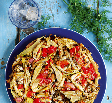 • Βάζουμε όλα τα υλικά για τη σάλτσα αντσούγιας στο μπλέντερ (ή στο μούλτι) και τα πολτοποιούμε πολύ καλά. Αφήνουμε το μείγμα κατά μέρος. • Κόβουμε τις καθαρισμένες καρδιές αγκινάρας στα τέσσερα και στη συνέχεια το κάθε τέταρτο σε λεπτές φέτες. • Σε μια μεγάλη πιατέλα απλώνουμε μια στρώση από φέτες μαραθόριζας και περιχύνουμε με 1-2 κ. σ. από τη σάλτσα αντσούγιας. Συνεχίζουμε με μια στρώση από φέτες αγκινάρας και περιχύνουμε πάλι με λίγη από τη σάλτσα. • Συνεχίζουμε με διαδοχικές στρώσεις λαχανικών με σάλτσα ενδιάμεσα, μέχρι να τελειώσουν τα λαχανικά. Αν περισσέψει σάλτσα, την σκεπάζουμε με μεμβράνη και την κρατάμε. • Τυλίγουμε την πιατέλα με διάφανη μεμβράνη και τη βάζουμε για 2 - 3 ώρες στο ψυγείο, ώστε να μαριναριστούν, να «ψηθούν» και να μαλακώσουν τα λαχανικά. • Για το σερβίρισμα βάζουμε τη ρόκα σε μια σαλατιέρα. Προσθέτουμε τα μαριναρισμένα λαχανικά μαζί με τη σάλτσα, ανακατεύουμε και σερβίρουμε.