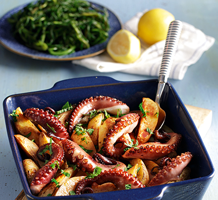 Βάζουμε μια μέτρια κατσαρόλα σε δυνατή φωτιά με το χταπόδι, τις δάφνες και το πιπέρι, τη σκεπάζουμε και την αφήνουμε για 10’. Μετά χαμηλώνουμε στο μέτριο και αφήνουμε 20’, για να βγάλει το χταπόδι τα ζουμιά του. Το βγάζουμε με πιρούνα, το κόβουμε στα πλοκάμια του, τα οποία ξαναρίχνουμε στο ζουμί τους. Προθερμαίνουμε τον φούρνο στους 170°C. Σε ένα ταψί διαμέτρου περίπου 32-36 εκ. αραδιάζουμε τις πατάτες και τις ανακατεύουμε με αλάτι, το σκόρδο, φρεσκοτριμμένο πιπέρι και το μισό ελαιόλαδο. Βάζουμε από πάνω το χταπόδι με τα ζουμιά του και τα μπαχαρικά, σκεπάζουμε το ταψί με λαδόκολλα και αλουμινόχαρτο και ψήνουμε το φαγητό για περίπου 45’. Στα μισά ελέγχουμε μήπως χρειαστεί να προσθέσουμε λίγο ζεστό νερό. Ξεσκεπάζουμε και ψήνουμε για ακόμα 15-20’, μέχρι να μαλακώσει το χταπόδι, να ροδίσουν οι πατάτες και να μείνει το φαγητό με το λάδι του. Αφήνουμε το ταψί στον φούρνο για 15’ με μισάνοιχτη πόρτα. Χοντροκόβουμε τον δυόσμο την τελευταία στιγμή και τον ανακατεύουμε με το υπόλοιπο ελαιόλαδο. Περιχύνουμε από πάνω το φαγητό και το σερβίρουμε με χόρτα και ελιές. Τip: Αν δεν έχουμε φρέσκο δυόσμο, μπορούμε να βάλουμε ξερό μαζί με 1/2 ματσάκι μαϊντανό, ψιλοκομμένο. Επίσης, αντί για ξερό δυόσμο μπορούμε να βάλουμε είτε μαντζουράνα είτε μάραθο.