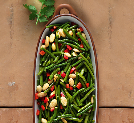 Βράζουμε τα φασολάκια σε κατσαρόλα με αλατισμένο νερό για 5’ και τα σουρώνουμε. Στην ίδια κατσαρόλα και σε μέτρια φωτιά σοτάρουμε στο ελαιόλαδο τα σκόρδα, να βγάλουν το άρωμά τους, προσθέτουμε τις πιπεριές, τα φασολάκια και συνεχίζουμε το σοτάρισμα σε μέτρια φωτιά για 4-5’. Προσθέτουμε τη soy sauce και ανακατεύουμε σε λίγο δυνατότερη φωτιά για 1-2’. Τα σερβίρουμε ζεστά ή σε θερμοκρασία δωματίου με λίγη από τη σουσαμένια σάλτσα, έξτρα λάιμ ή λεμόνι και πασπαλίζουμε με τα αμύγδαλα. Για το σερβίρισμα Έτοιμα νάτσος και τορτίγιες ολικής (πασπαλισμένες με πάπρικα και ψημένες για 15΄ στους 160° C).