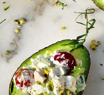 Γαρίδες: Χτυπάμε σε ένα μπολ το λάδι, τους χυμούς, το μέλι και τον άνηθο και ρίχνουμε μέσα τις γαριδούλες. Ανακατεύουμε καλά και αφήνουμε στην άκρη. Μαγιονέζα: Σε ένα μπολάκι χτυπάμε έντονα, με το πιρούνι, για σχεδόν 2’ τον μελάτο κρόκο, το χυμό λεμονιού, το ξίδι, τη μουστάρδα και το αλάτι. Το μείγμα πρέπει να γίνει κρεμώδες και λείο. Χωρίς να σταματήσουμε το χτύπημα, ρίχνουμε το ελαιόλαδο σε αργή ροή, μέχρι να φτιάξουμε ένα πυκνό, ανοιχτόχρωμο μείγμα - η διαδικασία μπορεί να θα κρατήσει περίπου 5’ . Αβοκάντο: Κόβουμε στη μέση τα αβοκάντο, πετάμε τα κουκούτσια και ξεφλουδίζουμε τη σάρκα τους, την οποία λιώνουμε σε ένα μεγάλο μπολ και ραντίζουμε με το χυμό λεμονιού, για να μην μαυρίσει. Κρατάμε και τις ατόφιες φλούδες των αβοκάντο, στις οποίες θα σερβίρουμε το ορεκτικό. Προσθέτουμε τα φρέσκα κρεμμυδάκια, τη σπιτική μας μαγιονέζα και το εστραγκόν και γεμίζουμε τις φλούδες των αβοκάντο. Στολίζουμε με τις μαριναρισμένες γαρίδες ραντίζουμε λίγο με το νόστιμο ζουμί τους και πασπαλίζουμε με αλάτι και πιπέρι. Σερβίρουμε αμέσως.