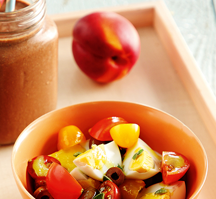 Σε ένα μπολ βάζουμε τα ντοματίνια, τα αλατοπιπερώνουμε και τα ανακατεύουμε με το πέστο βασιλικού. Βάζουμε σε πιατέλα τα αβγά, αλατοπιπερώνουμε, σκορπάμε γύρω τα ντοματίνια και την μοτσαρέλα και ραντίζουμε με το ελαιόλαδο. Πασπαλίζουμε με φρεσκοτριμμένο πιπέρι και σερβίρουμε.
