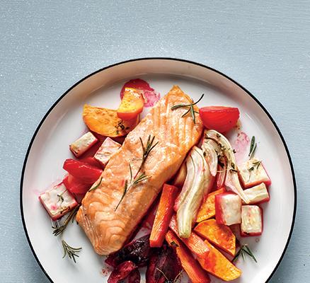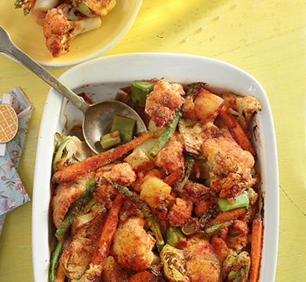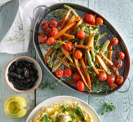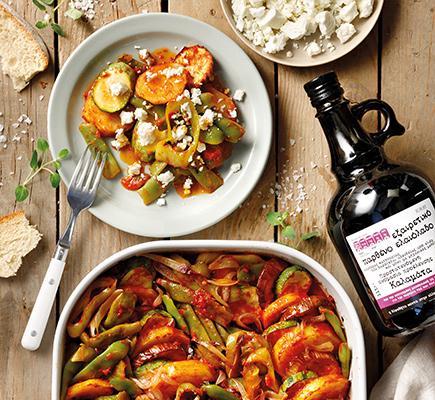 1Ανακατεύουμε όλα τα υλικά σε ένα σχετικά μεγάλο ταψί και μετά στρώνουμε τα λαχανικά, ώστε να μισοκαλύπτει σχετικά το ένα το άλλο. Ψήνουμε στους 170°C για 30’, βγάζουμε και ανακατεύουμε προσεκτικά για να μην τα λιώσουμε, και συνεχίζουμε το ψήσιμο μέχρι να ροδίσουν και να μελώσουν, για περίπου 30-40’ ακόμα. Αποσύρουμε απ’ τον φούρνο, αφήνουμε το φαγητό για 5-10’ να πέσει ο βρασμός και σερβίρουμε συνοδεύοντας με χυμό λεμονιού, ταραμοσαλάτα ή/και ντοματοσαλάτα με κρεμμύδι και βασιλικό, και χωριάτικο ζυμωτό ψωμί. ΤΙΠ: Το μυστικό είναι στο κόψιμο, για να ψηθούν ομοιόμορφα. Φροντίζουμε λοιπόν τα λαχανικά να έχουν το ίδιο πάχος είτε είναι κομμένα σε μακρόστενα κομμάτια είτε σε κύβους.