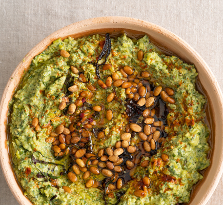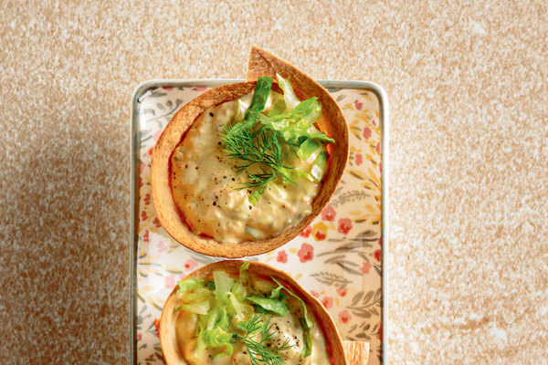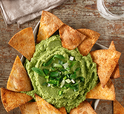 “ Προθερμαίνουμε τον φούρνο στους 150° C. Ανακατεύουμε το ελαιόλαδο με την πάπρικα και αλείφουμε τις τορτίγιες βάζοντας τη μία πάνω στην άλλη. Κόβουμε κάθε τορτίγια σε 6-8 τρίγωνα. Καλύπτουμε με λαδόκολλα τη λαμαρίνα του φούρνου και απλώνουμε τα τρίγωνα σε μια στρώση. Ψήνουμε 30 λεπτά, μέχρι να γίνουν τραγανές. Βγάζουμε από το φούρνο και αφήνουμε να κρυώσουν. Σε μια κατσαρόλα με άφθονο νερό που κοχλάζει, ρίχνουμε αλάτι και τον αρακά και βράζουμε για 8-10 λεπτά. Στραγγίζουμε και τον κρυώνουμε με τρεχούμενο νερό. (Ετσι θα διατηρήσει και το φρέσκο πράσινο χρώμα του). Χτυπάμε στον πολυκόφτη τον αρακά με αλατοπίπερο, το