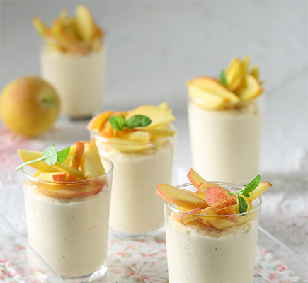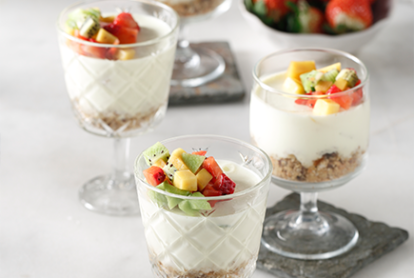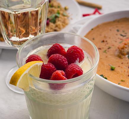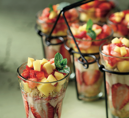 “ – Σε μια μπασίνα χτυπάμε ελαφρά με σύρμα το γιαούρτι και το ανθόνερο μέχρι να πάρουμε ένα λείο μείγμα. – Φτιάχνουμε τη σαντιγί χτυπώντας με το σύρμα του μίξερ την κρύα κρέμα γάλακτος με τη ζάχαρη άχνη. Προσέχουμε να μην την παραχτυπήσουμε και κόψει. – Ρίχνουμε στο μείγμα τη σαντιγί σε τρεις δόσεις, ενσωματώνοντάς την με μια μαρίζ. Βάζουμε τη μους που φτιάξαμε στο ψυγείο. – Στη συνέχεια φτιάχνουμε τη σάλτσα των φρούτων. Σε ένα μικρό κατσαρολάκι βράζουμε τη ζάχαρη με το νερό. Ελέγχουμε με θερμόμετρο και μόλις η θερμοκρασία φτάσει στους 118ΊC προσθέτουμε τα φρούτα και ανακατεύουμε με