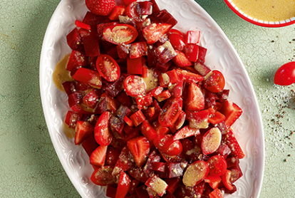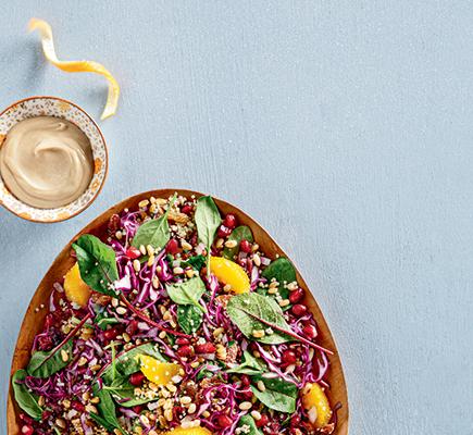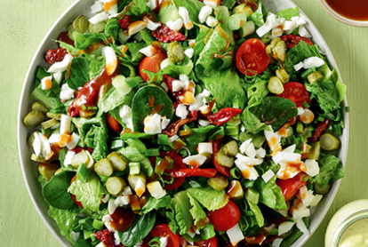 • Σε ένα μπλέντερ βάζουμε τα υλικά για το λαδολέμονο και τα πολτοποιούμε καλά, ώστε να φτιάξουμε ένα λείο και κρεμώδες μείγμα. • Σε ένα μεγάλο μπολ βάζουμε όλα τα υλικά της σαλάτας και τα ανακατεύουμε καλά. Περιχύνουμε με το λαδολέμονο και ανακατεύουμε. Μεταφέρουμε σε μεγάλη και βαθιά πιατέλα και σερβίρουμε αμέσως. • Αν ετοιμάσουμε από νωρίς τη σαλάτα δεν ρίχνουμε το λαδολέμονο, παρά την τελευταία στιγμή πριν το σερβίρισμα.