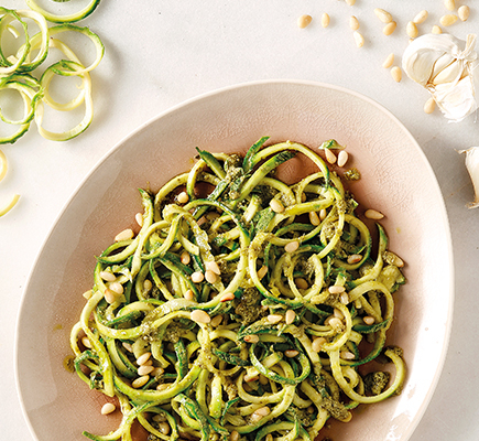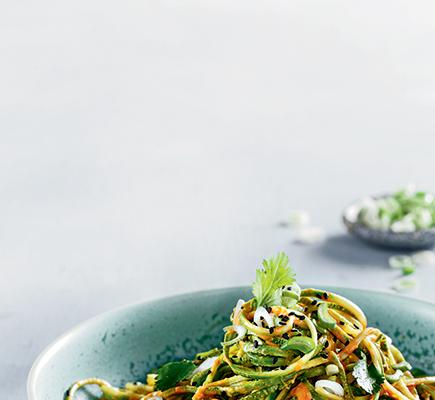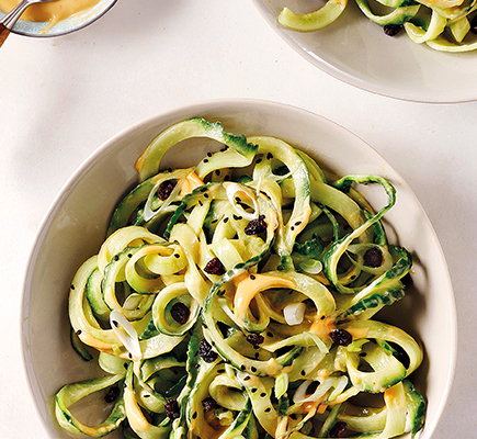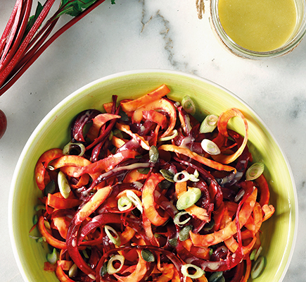 Ξεφλουδίζουμε 3-4 παντζάρια και 2 μεγάλες γλυκοπατάτες και τα κόβουμε σε σπιράλ μακριές λωρίδες με το ειδικό εργαλείο spiralizer. Αν οι λωρίδες είναι πολύ μακριές, τις κόβουμε σε μικρότερα κομμάτια. Ανακατεύουμε όλες τις λωρίδες σε σαλατιέρα και προσθέτουμε 4 φρέσκα κρεμμυδάκια, σε φετάκια, και 1/2 φλ. κολοκυθόσπορους ψημένους. Σε ένα μπολάκι χτυπάμε με ένα πιρούνι καλά το ξύσμα από 1 λεμόνι και τον χυμό από 2 λεμόνια μαζί με 1 σκελίδα σκόρδο, ψιλοκομμένη, 2 κ.σ. μέλι, 1/3 φλ. ελαιόλαδο, 2 κ.σ. φυτική κρέμα και αλατοπίπερο. Περιχύνουμε τη σαλάτα με 4-5 κ.σ. από τη σος, ανακατεύουμε και σερβίρουμε.