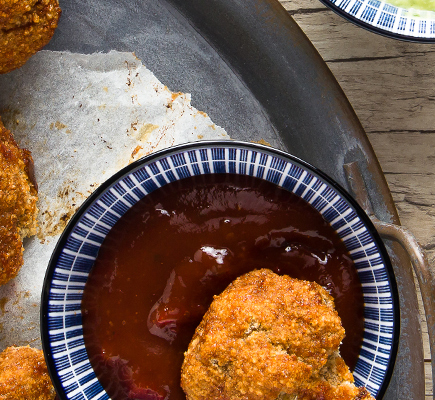 Βράζουμε τα ζυμαρικά σε κατσαρόλα με μπόλικο αλατισμένο νερό σύμφωνα με τις οδηγίες που αναγράφονται στην συσκευασία. Τα στραγγίζουμε και τα αφήνουμε στην άκρη. Προθερμαίνουμε το φούρνο στους 190°C. Στρώνουμε τη λαμαρίνα του φούρνου με αντικολλητικό χαρτί. Σε ένα μπολ ανακατεύουμε τη φρυγανιά με την παρμεζάνα, τη ρίγανη, τη σκόνη σκόρδου, το μπούκοβο, το βούτυρο, αλάτι και φρεσκοτριμμένο πιπέρι. Σε ένα άλλο μπολ βάζουμε το αλεύρι και σε ένα τρίτο τα αβγά. Αλευρώνουμε ένα ένα τα ζυμαρικά, κατόπιν τα βουτάμε στα χτυπημένα αβγά και τέλος τα πανάρουμε στο μείγμα της φρυγανιάς. Τα μεταφέρουμε στη λαμαρίνα και ψήνουμε για 25 ‘ ή μέχρι να ροδίσουν. Για τη σάλτσα: Εντωμεταξύ, σε ένα μικρό κατσαρολάκι ανακατεύουμε το χυμό ανανά με την καστανή ζάχαρη, το ξίδι ρυζιού, το κέτσαπ και τη σάλτσα σόγιας και βράζουμε για 3 ‘. Προσθέτουμε το κορνφλάουρ και ανακατεύουμε βράζοντας για 1' ακόμα μέχρι να δέσει. Αποσύρουμε από τη φωτιά σε βάζουμε σε μπολάκι. Σερβίρουμε τα ζυμαρικά πασπαλισμένα με τον ψιλοκομμένο μαϊντανό και την γλυκόξινη σάλτσα.