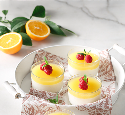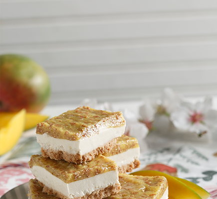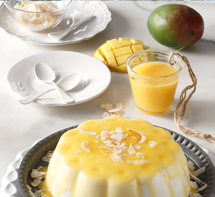 Σε μια μέτρια κατσαρόλα βάζουμε το γάλα καρύδας, τα κεδροκούκουτσα, τα καρδάμωμα, την κανέλα και τη βανίλια, προσθέτουμε 140g. από τη ζάχαρη και ζεσταίνουμε σε χαμηλή φωτιά, μέχρι να αρχίσει να αφρίζει απαλά. Αποσύρουμε από τη φωτιά, σκεπάζουμε το σκεύος και το βάζουμε στο ψυγείο για όλο το βράδυ. Την επόμενη ημέρα αλείφουμε με λίγο ηλιέλαιο 4 φορμίτσες των 400 ml ή 4 φαρδιά ποτήρια. Χτυπάμε στο μούλτι 140g από τη σάρκα των μάνγκο, μαζί με την υπόλοιπη ζάχαρη και το χυμό λάιμ, μέχρι να γίνουν λείος πολτός (όση σάρκα περισσέψει την ψιλοκόβουμε και την αφήνουμε κατά μέρος για το σερβίρισμα). Ρίχνουμε τον πολτό σε ένα κατσαρολάκι, προσθέτουμε 1 κ.σ. από το άγαρ-άγαρ, ανακατεύουμε και αφήνουμε να διαλυθεί, εκτός φωτιάς, για 5' . Βάζουμε το κατσαρολάκι σε χαμηλή φωτιά και βράζουμε για 5' , ανακατεύοντας συνεχώς. Αφήνουμε να κρυώσει ελαφρά, μοιράζουμε το μείγμα στα 4 φορμάκια ή στα ποτήρια και βάζουμε στο ψυγείο για 2 ώρες. Σουρώνουμε το γάλα καρύδας το ξαναβάζουμε στο κατσαρολάκι, προσθέτουμε τις υπόλοιπες 3 κ.σ. άγαρ-άγαρ και σιγοβράζουμε σε πολύ χαμηλή φωτιά για 5 - 7' , ανακατεύοντας συνέχεια. Αποσύρουμε και αφήνουμε το μείγμα να κρυώσει. Το μοιράζουμε στα ποτήρια με τον κρύο πολτό μάγκο και ξαναβάζουμε στο ψυγείο για τουλάχιστον 4 ώρες. Σερβίρισμα: Βυθίζουμε τς φορμάκια ή τα ποτήρια σε μπολ με καυτό νερό, για 10'' (προσέχοντας να μην πέσει νερό μέσα στην κρέμα) και τα αναποδογυρίζουμε αμέσως σε ατομικά πιάτα. Σκορπίζουμε σε κάθε κρέμα την καρύδα, τα κομματάκια μάνγκο που αφήσαμε στην άκρη και τα φυλλαράκια μέντας και σερβίρουμε.