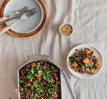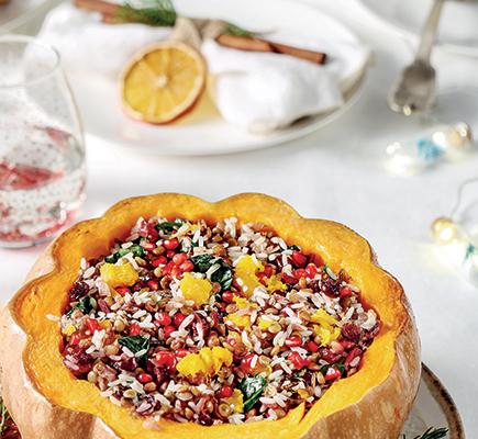 Προθερμαίνουμε το φούρνο στους 200oC στη λειτουργία του αέρα. Βάζουμε την κολοκύθα σε ένα ταψάκι και τα ψήνουμε για 5’ . Προσθέτουμε τα αμύγδαλα και συνεχίζουμε το ψήσιμο για άλλα 15’ . Βγάζουμε από το φούρνο, προσθέτουμε το ελαιόλαδο, το χυμό λεμονιού, αλάτι και πιπέρι, ανακατεύουμε και αφήνουμε κατά μέρος. Σε μια μέτρια κατσαρόλα ζεσταίνουμε το βούτυρο καρύδας σε μέτρια φωτιά και σοτάρουμε το ρύζι με το κρεμμύδι, για 5’ , ανακατεύοντας. Χαμηλώνουμε τη φωτιά αρκετά και συνεχίζουμε το σοτάρισμα για άλλα 15’ , μέχρι να καραμελώσει το κρεμμύδι. Προσθέτουμε τις σταφίδες, την κανέλα, το γαρίφαλο, το καρδάμωμο και το ξύσμα λεμονιού, ρίχνουμε και το ζεστό νερό, ανακατεύουμε και αφήνουμε να πάρει μια βράση. Χαμηλώνουμε τη φωτιά και μαγειρεύουμε με ξεσκέπαστη κατσαρόλα, χωρίς να ανακατεύουμε, για 15’ ή για όσο χρόνο αναγράφεται στη συσκευασία του ρυζιού και να σωθεί το νερό. Αφαιρούμε τα μπαχαρικά (έχουν ανέβει στην επιφάνεια αφού δεν ανακατεύουμε το ρύζι), προσθέτουμε το μείγμα κολοκύθας και ανακατεύουμε ελαφρά. Σκεπάζουμε την κατσαρόλα με μια καθαρή πετσέτα (ή αδειάζουμε το ρύζι σε μια φόρμα αλειμμένη με βούτυρο και σκεπάζουμε τη φόρμα). Αφήνουμε για 15’ και σερβίρουμε.