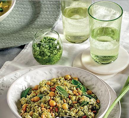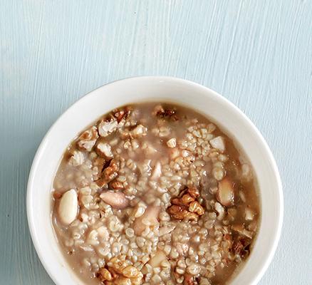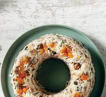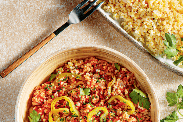“ – Σε ένα φαρδύ μπολ ρίχνουμε το πλιγούρι και προσθέτουμε το καυτό νερό ώστε να το καλύψει καλά. – Αφήνουμε το πλιγούρι για 15-20 λεπτά μέχρι να απορροφήσει το νερό, να φουσκώσει και να μαλακώσει, και στη συνέχεια το στύβουμε καλά με τα χέρια και το μεταφέρουμε σε ένα καθαρό μπολ. – Προσθέτουμε τον χυμό λεμονιού, τον δυόσμο, τον μαϊντανό, τις σταφίδες, τα βερίκοκα, τα αμύγδαλα, αλάτι και πιπέρι, και ανακατεύουμε καλά. – Σκεπάζουμε το μπολ με ένα πιάτο και αφήνουμε κατά μέρος για 10 λεπτά, μέχρι να αναμειχθούν καλά τα αρώματα. “