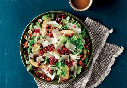 Για την βινεγκρέτ: Βάζουμε τα φύλλα δυόσμου και το χυμό λεμονιού σε ένα μούλτι και πολτοποιούμε. Προσθέτουμε τη ζάχαρη, αλάτι, πιπέρι και τον μαραθόσπορο και «χτυπάουμε» λίγο τα υλικά για να ενωθούν. Αδειάζουμε το μείγμα σε ένα μπολ και προσθέτουμε το ελαιόλαδο. Ανακατεύουμε καλά. Σαλάτα: Σε μια μεγάλη σαλατιέρα ανακατεύουμε τα σαλατικά, το φινόκιο, τα φουντούκια και το ρόδι. Ραντίζουμε με τη μισή βινεγκρέτ και ανακατεύουμε καλά. Προσθέτουμε την γραβιέρα και ραντίζουμε με την υπόλοιπη βινεγκρέτ.