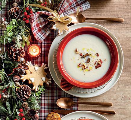 “ – Σε μια σχετικά μεγάλη κατσαρόλα ζεσταίνουμε το βούτυρο και προσθέτουμε τα βρασμένα κάστανα. Σοτάρουμε για 3-4 λεπτά και ρίχνουμε το πράσο, το καρότο και το σέλερι. Συνεχίζουμε το σοτάρισμα για 2-3 λεπτά ακόμα. – Σβήνουμε με το κονιάκ και μόλις εξατμιστεί το αλκοόλ προσθέτουμε τον ζωμό κότας. Αφήνουμε τη σούπα να βράσει για 30-35 λεπτά μέχρι να μαλακώσουν τα κάστανα. – Αποσύρουμε την κατσαρόλα από τη φωτιά και πολτοποιούμε με ραβδομπλέντερ απευθείας στην κατσαρόλα ή μεταφέρουμε τη σούπα σε μπλέντερ και πολτοποιούμε εκεί. – Ξαναρίχνουμε τη σούπα στην κατσαρόλα, αλατοπιπερώνουμε και πασπαλίζουμε με τα μπαχαρικά (κόλιανδρο, γλυκάνισο, κανέλα).