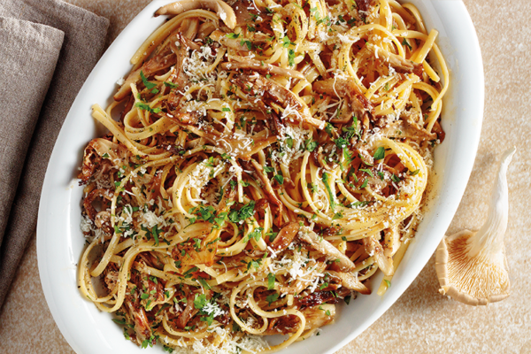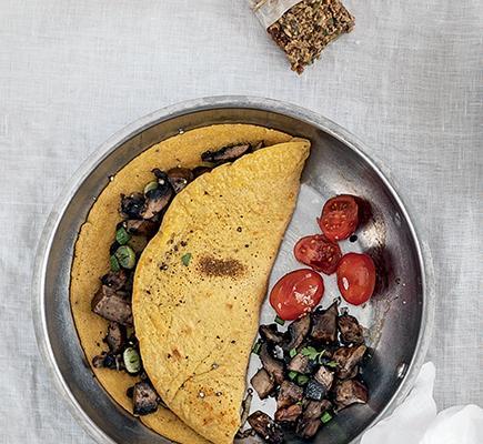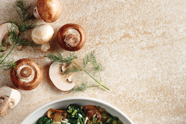 “ – Σκουπίζουμε καλά τα μανιτάρια με καθαρή, βαμβακερή, νοτισμένη πετσέτα, για να απομακρύνουμε τυχόν χώματα. Κόβουμε τις χοντρές άκρες των κοτσανιών, τις πετάμε και κόβουμε τα μανιτάρια σε λεπτές φέτες. Τις βάζουμε σε ένα μπολ, ραντίζουμε με τον χυμό λεμονιού και ανακατεύουμε καλά. – Σε ένα αντικολλητικό τηγάνι ζεσταίνουμε το ελαιόλαδο σε μέτρια φωτιά και σοτάρουμε το κρεμμύδι για 2 λεπτά, μέχρι να μαλακώσει. Προσθέτουμε αλάτι και πιπέρι, ρίχνουμε το σκόρδο, και σοτάρουμε για άλλο 1 λεπτό ανακατεύοντας τακτικά με ξύλινη κουτάλα. – Αποσύρουμε το τηγάνι από τη φωτιά, αδειάζουμε το περιεχόμενό του σε ένα μπολ και το αφήνουμε