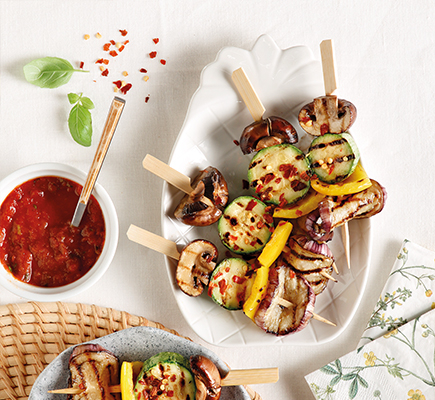 Προθερμαίνουμε τον φούρνο στους 180οC, στον αέρα. Βάζουμε τα κολοκύθια και τη μελιτζάνα σε σουρωτήρι, τα αλατίζουμε και τα αφήνουμε για 30’. Βάζουμε τις πατάτες σε ένα ταψί και τις ψήνουμε για 30-40’, μέχρι να μαλακώσουν. Μόλις περάσουν 15’, προσθέτουμε και τις μελιτζάνες (καλά στυμμένες και στεγνωμένες σε χαρτί), ώστε να ψηθούν λίγο. Όταν είναι έτοιμα, βάζουμε σε ένα μεγάλο μπολ το ελαιόλαδο, το λεμόνι, τη μουστάρδα, το σκόρδο, ανακατεύουμε, ρίχνουμε μέσα όλα τα λαχανικά και τις μελιτζάνες (αφού ψηθούν), αλατοπιπερώνουμε και αφήνουμε να μαριναριστούν για 1 ώρα. Προσθέτουμε και τις πατάτες. Ανακατεύουμε και καρφώνουμε στα ξυλάκια τα λαχανικά εναλλάξ και τα στοιχίζουμε σε μια σχάρα πάνω σε ένα ταψί. Ανάβουμε το γκριλ του φούρνου στους 200ο C. Ψήνουμε στη μεσαία σχάρα για 10-13’ και στη συνέχεια αναποδογυρίζουμε τα καλαμάκια και ψήνουμε για άλλα 5-7’. Σερβίρουμε με τη σουσαμένια σάλτσα και έξτρα χυμό λεμονιού. Γουακαμόλε Σε ένα μπολ ανακατεύουμε το σκόρδο κοπανισμένο με το ελαιόλαδο, το χυμό και ξύσμα από 1 λάιμ ή μικρό λεμόνι, τα αβοκάντο, σε κομμάτια, τον κόλιανδρο, τις τομάτες,το κρεμμύδι και το τσίλι,. Σάλτσα σουσάμι Σε ένα μπολ ανακατεύουμε το ελαιόλαδο με το ξίδι, τον χυμό λάιμ ή λεμονιού, το soy sauce, το ξύσμα λάιμ ή λεμονιού, τη ζάχαρη, το τζίντζερ, το σησαμέλαιο, το σουσάμι καβουρντισμένο και το φιστικοβούτυρο.