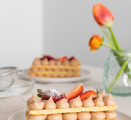 “ – Με ένα σύρμα χειρός χτυπάμε τους κρόκους με το αυγό, τη μισή περίπου ζάχαρη και το κορν φλάουρ, μέχρι να σχηματίσουν ένα ομογενές μείγμα. – Βράζουμε το γάλα μαζί με 100 γρ. κρέμα γάλακτος, τη βανίλια, το ξύσμα λεμονιού και την υπόλοιπη ζάχαρη. Τα προσθέτουμε σιγά-σιγά στο μείγμα των κρόκων, ανακατεύοντας συνεχώς με σύρμα χειρός, έτσι ώστε να ανεβάσουν θερμοκρασία όλα τα υλικά. – Περνάμε το μείγμα από ψιλό σουρωτήρι και το ξαναρίχνουμε στην κατσαρόλα. Βράζουμε σε ήπια φωτιά μέχρι να πήξει, συν 1 λεπτό επιπλέον. Κατά τη διάρκεια του βρασμού ανακατεύουμε ζωηρά με σύρμα χειρός, ξύνοντας κάθε