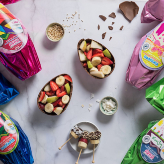 Κόβουμε τα φρούτα σε κομμάτια και τα σερβίρουμε μαζί με το σπασμένο σοκολατένιο αβγό.