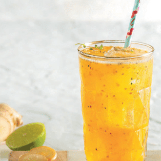 • Ανακατεύουμε το τζίντζερ, τον κουρκουμά, το μέλι, τον χυμό λάιμ, τους κόκκους μαύρου πιπεριού και 3 φλιτζάνια νερό στο μπλέντερ μέχρι να ομογενοποιηθούν. Στραγγίζουμε μέσα από ένα λεπτό κόσκινο σε ένα μεγάλο μπολ. Ρίχνουμε τους σπόρουςchia και τους αφήνουμε να καθίσουν μέχρι να αρχίσουν να φουσκώνουν, για περίπου 8-10´.