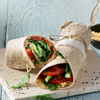 Αλείφουμε την πίτα με το χούμους, βάζουμε την ντομάτα, μετά το μαυροκούκι, τα φύλλα ρόκας και στο τέλος το αγγούρι.