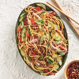 Ασιατική μακαρονοσαλάτα με φρέσκο κρεμμυδάκι, κόλιανδρο και σουσάμι