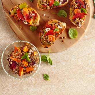 Μπρουσκέτες με πέστο, περίσσευμα από σαλάτα φακής και τραγανό προσούτο