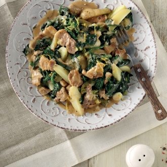 Αποσύρουμε από τη φωτιά και προσθέτουμε τα υπόλοιπα υλικά. Ανακατεύ-ουμε καλά για να ενωθούν και σερβίρουμε μαζί με το χοιρινό με τις πατάτες.