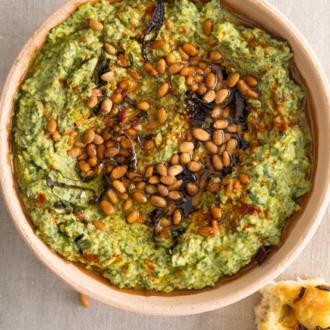 - Σερβίρουμε το χούμους ιδανικά σε θερμοκρασία δωματίου, περιχύνοντάς το με 1-2 κ.σ. ελαιόλαδο, καβουρδισμένο κουκουνάρι και λίγη πάπρικα.