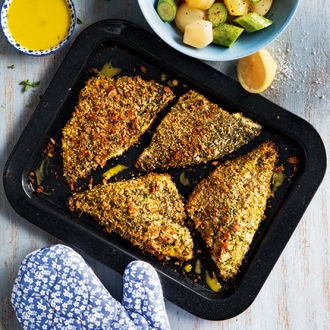 Αλείφουμε τα φιλέτα με λίγο λαδολέμονο και τα πασπαλίζουμε πάνω από το πιάτο με την κρούστα, για να μη χάνουμε υλικό.