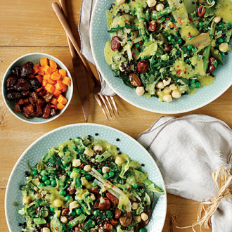 Φρικασέ με ανοιξιάτικες πρασινάδες και μείγμα από όσπρια αρωματισμένα με δυόσμο