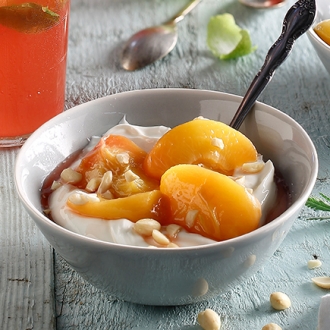 Γιαούρτι με ελαφριά κομπόστα ροδάκινο με μέλι και αμύγδαλα