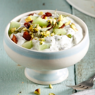 Γιαούρτι με σιναπόσπορο, λουίζα, πεπόνι και φιστίκι Αιγίνης