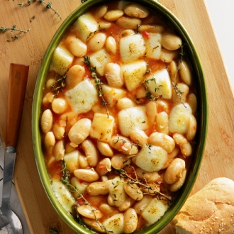 Στραγγίζουμε τα φασόλια και κρατάμε τον ζωμό. Τα βάζουμε σε μια γάστρα, ρίχνουμε μέσα το υπόλοιπο λάδι, το μείγμα ντομάτας, το θυμάρι και τα ανακατεύουμε απαλά. Προσθέτουμε από τον ζωμό των φασολιών που έχουμε κρατήσει για να τα καλύψουμε και σκεπάζουμε τη γάστρα με το καπάκι της. Ψήνουμε τα φασόλια στον φούρνο για 1 ώρα, ελέγχοντας το υγρό και προσθέτοντας κι άλλο αν χρειάζεται, για να υπάρχει αρκετή σάλτσα, χωρίς όμως να γίνουν σούπα. Μετά ξεσκεπάζουμε και ρίχνουμε αλάτι, φρεσκοτριμμένο πιπέρι, το κρασί, το κεφαλοτύρι και συνεχίζουμε το ψήσιμο για 30 λεπτά ακόμα, μέχρι τα φασόλια να μαλακώσουν πολύ και να χυλώσουν. Βγάζουμε το ταψί από τον φούρνο και τα σερβίρουμε ζεστά ή σε θερμοκρασία δωματίου.