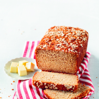 Ψήνουμε για 45 λεπτά στους 170-180°C. Αφήνουμε να κρυώσει για 10 λεπτά στη φόρμα, ξεφορμάρουμε και αφήνουμε άλλα 40 λεπτά να κρυώσει καλά. Κόβουμε σε φέτες και σερβίρουμε με ένα καλό βούτυρο ή ένα βούτυρο ξηρού καρπού, μέλι ή πετιμέζι.