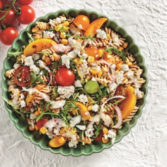 Kαλοκαιρινή μακαρονοσαλάτα με ροδάκινο, καλαμπόκι και ρόκα
