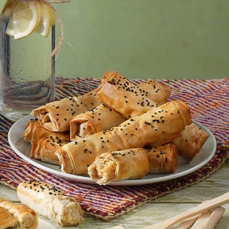 Απλώνουμε 2 κουταλιές γέμιση κατά μήκος της μακριάς πλευράς κάθε φύλλου, κλείνουμε τις άκρες προς τα μέσα και τυλίγουμε σε φλογέρα. Συνεχίζουμε μέχρι να μας τελειώσουν τα υλικά.