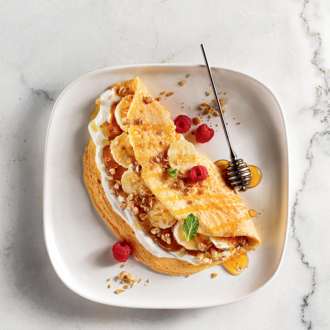 • Αφαιρούμε από το γκριλ, απλώνουμε τα υλικά της γέμισης και διπλώνουμε την κρεπολέτα. Σερβίρουμε με επιπλέον γκρανόλα, φρούτα, φυλλαράκια δυόσμου και λίγο μέλι.