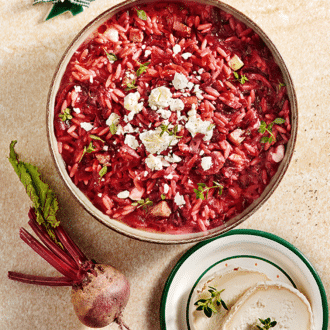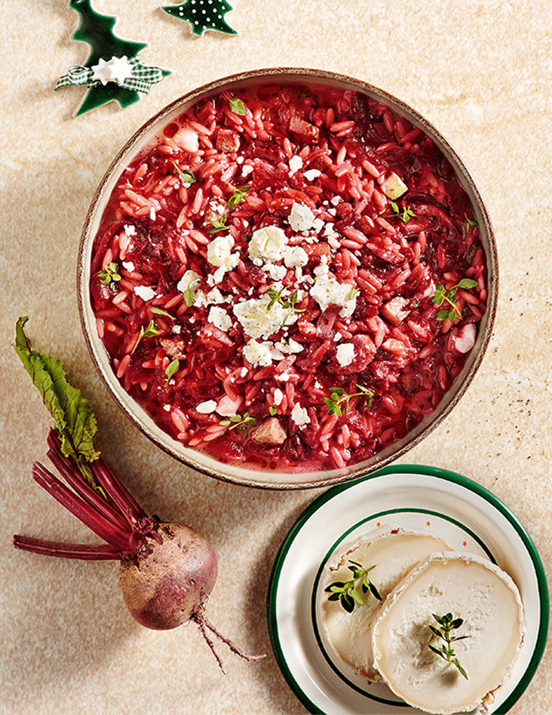 Κριθαρότο με παντζάρι, απάκι και κατσικίσιο τυρί