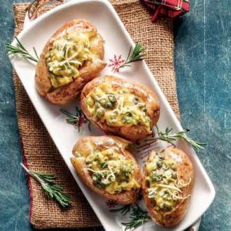 - Βγάζουμε τις πατάτες από τον φούρνο, τις κόβουμε στη μέση, τις αλατίζουμε, γαρνίρουμε με τη σάλτσα και σερβίρουμε.
