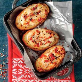 - Διαλέγουμε 8 ίδιου μεγέθους πατάτες (περίπου 180-200 γρ.) για να ψηθούν στον ίδιο χρόνο, τις πλένουμε καλά και τις ψήνουμε στον φούρνο τυλιγμένες σε αλουμινόχαρτο για 1 ώρα. Τις αφήνουμε να κρυώσουν ελαφρώς.