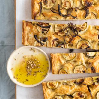 - Όσο φουσκώνει η ζύμη, σε μπολ ανακατεύουμε τα κρεμμύδια και τα κολοκυθάκια με 2-3 κ.σ. ελαιόλαδο, αλάτι και πιπέρι.