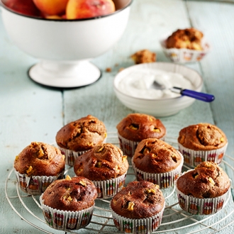Μοιράζουμε το μείγμα στα φορμάκια και ψήνουμε για περίπου 25-30’ λεπτά‘. Ξεφορμάρουμε πάνω σε σχάρα για να κρυώσουν και συνοδεύουμε με ρόφημα λουίζας και γιαούρτι δίπλα στα μάφιν.