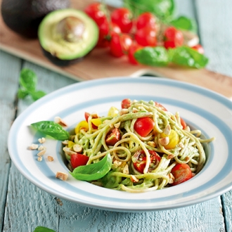 Σπαγγέτι ολικής άλεσης με κρέμα αβοκάντο, ντοματίνια και καβουρντισμένα αμύγδαλα